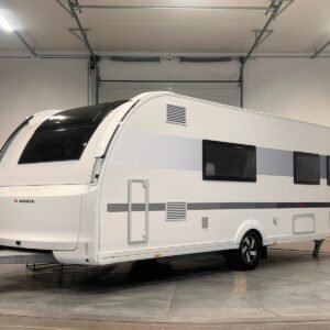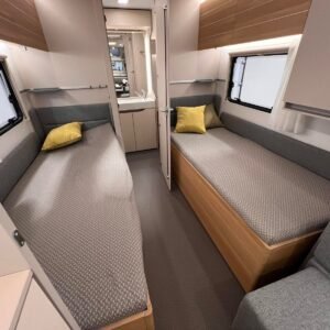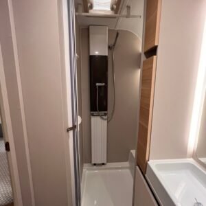 Grande salle de bains à l’arrière de la caravane avec d’excellentes installations de douche