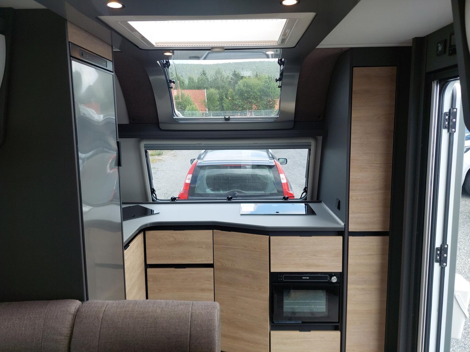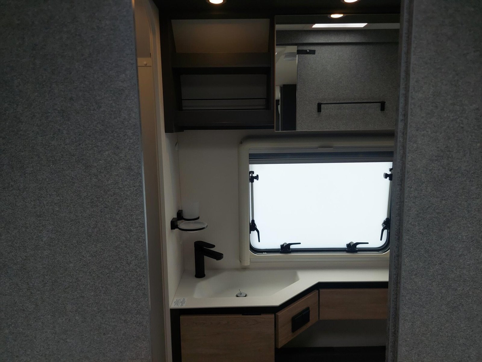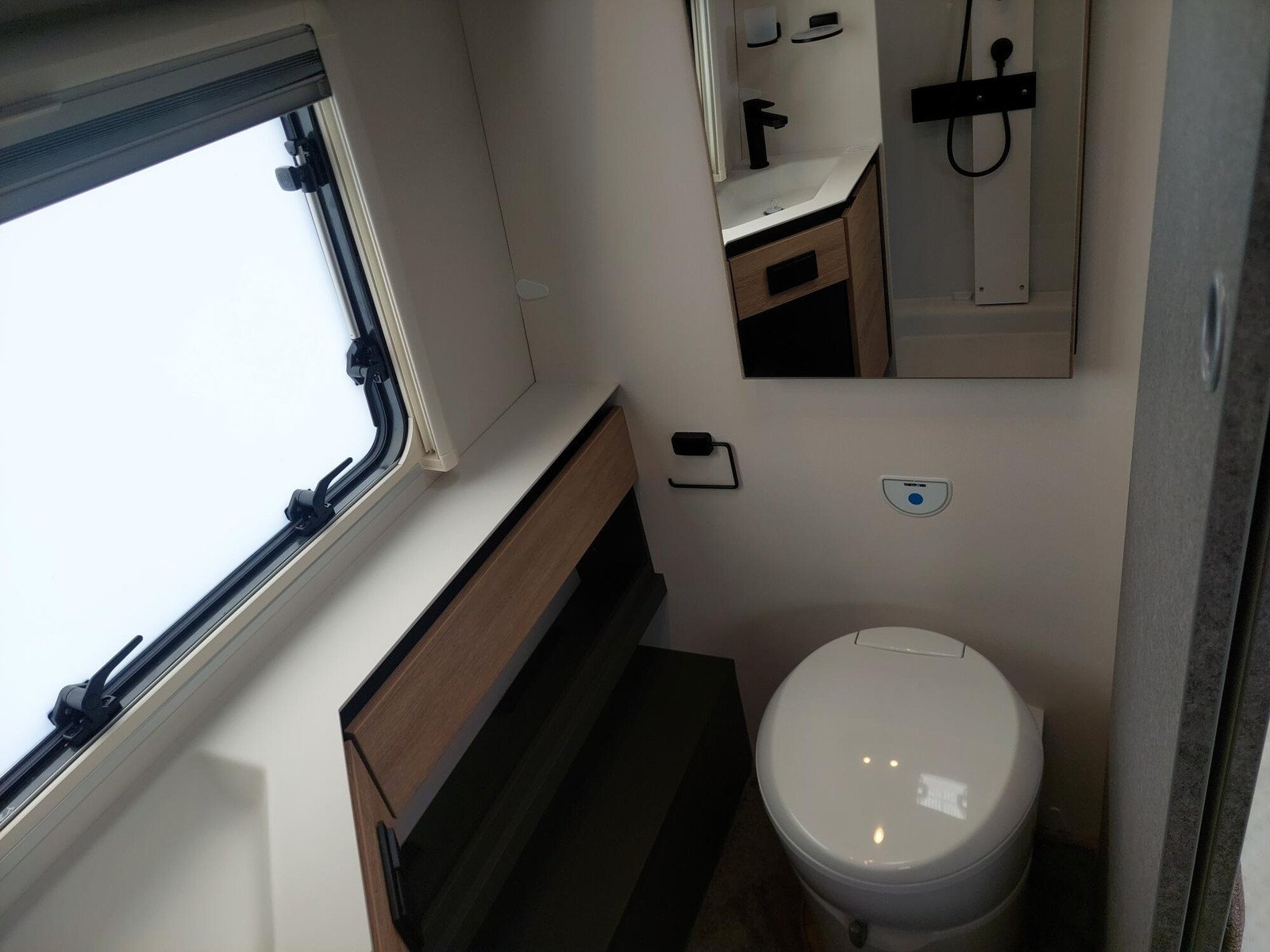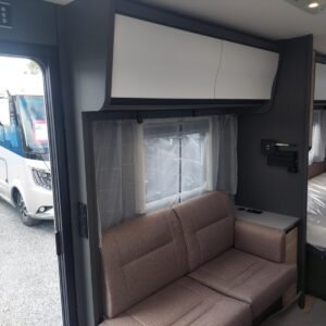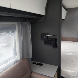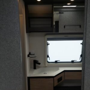 La cuisine à l’avant du Beduin est tout simplement phénoménale. Elle impressionne par son équipement, ses rangements et ses accoudoirs. La grande baie vitrée laisse entrer beaucoup de lumière et d’air frais tout en offrant une belle vue. Le spacieux lit double central peut être avancé et reculé, offrant un meilleur accès à la salle de bain pendant la journée. Sous le lit se trouve un grand compartiment de rangement, également accessible depuis l’extérieur.