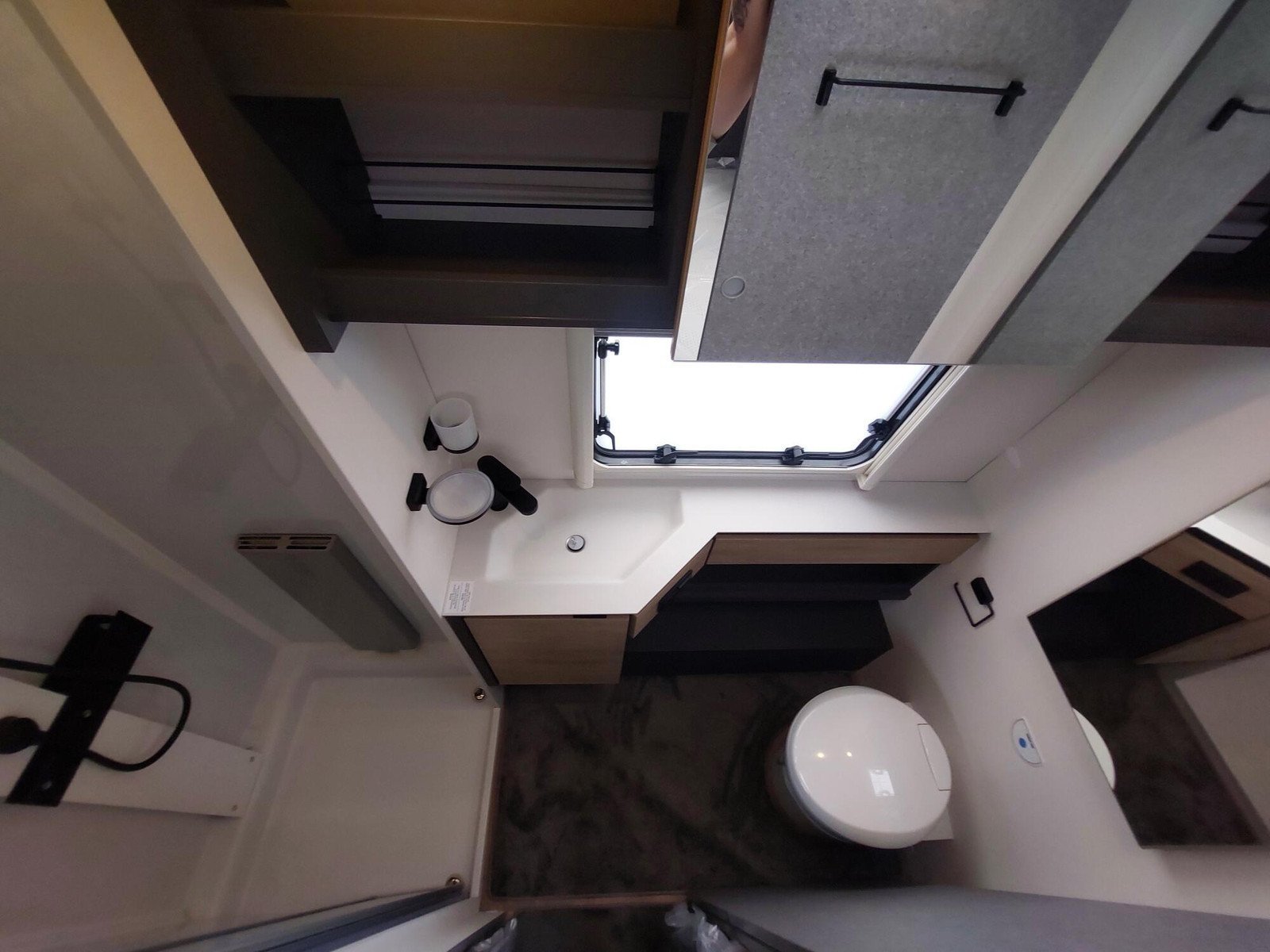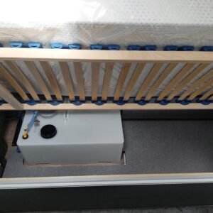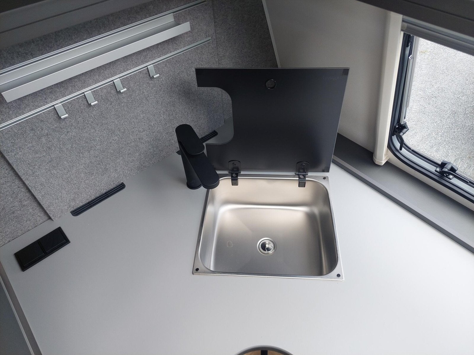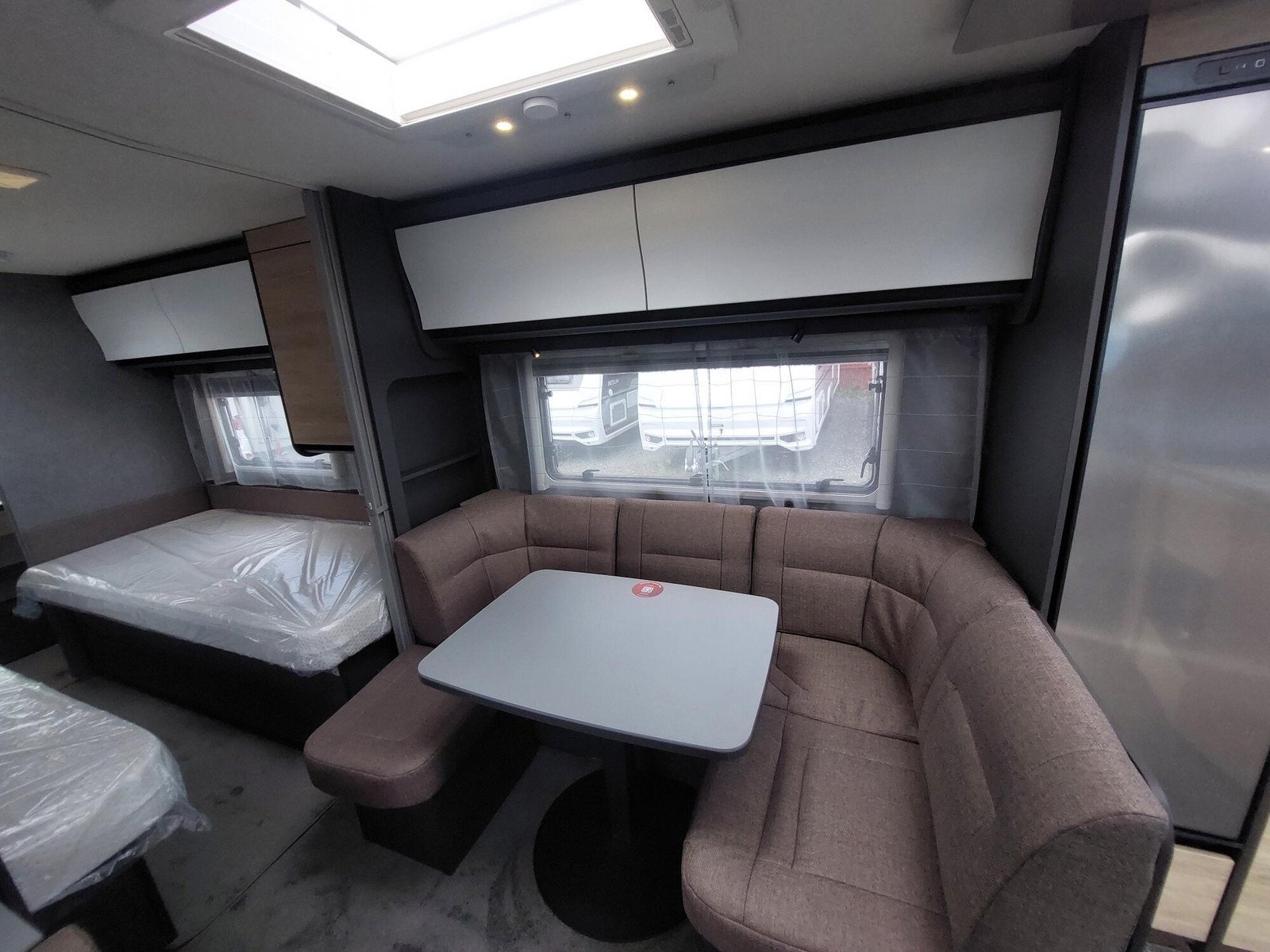 La cuisine à l’avant du Beduin est tout simplement phénoménale. Elle impressionne par son équipement, ses rangements et ses accoudoirs. La grande baie vitrée laisse entrer beaucoup de lumière et d’air frais tout en offrant une belle vue. Le spacieux lit double central peut être avancé et reculé, offrant un meilleur accès à la salle de bain pendant la journée. Sous le lit se trouve un grand compartiment de rangement, également accessible depuis l’extérieur.