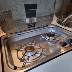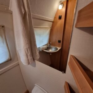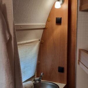 La cuisine est à l’arrière, la salle de bain au milieu et un coin salon à l’avant, transformable en un grand lit en quelques minutes. La caravane est très accueillante grâce à son agencement astucieux. Les fenêtres tout autour laissent entrer la lumière.