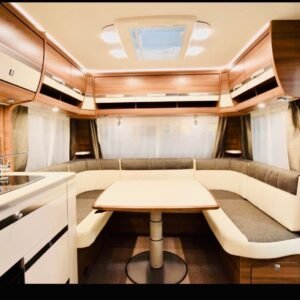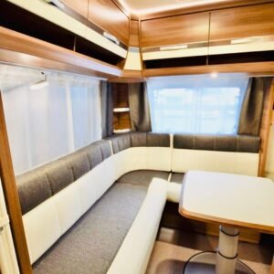 Tôles latérales lisses et rebords aluminium, moquette de lit, moquette de sol, tableau de commande 12V, extincteur, rallonge de plan de cuisine, éclairage indirect, porte d’entrée avec fenêtre et porte moustiquaire, Softclose sur trappes de placards de pavillon