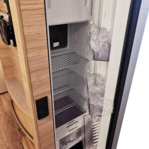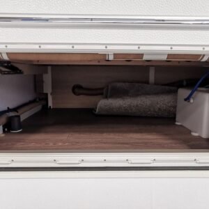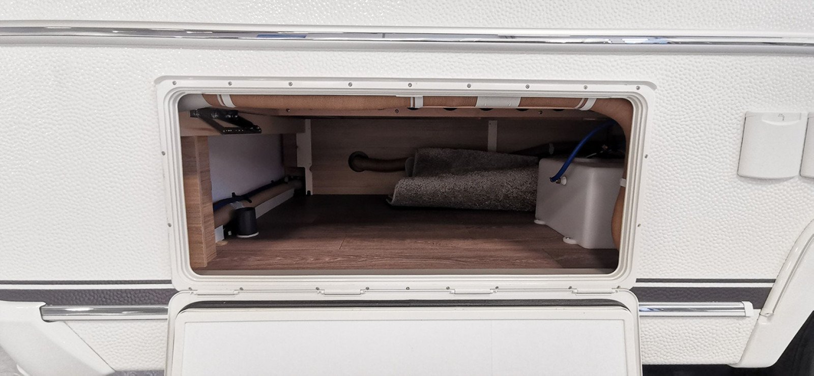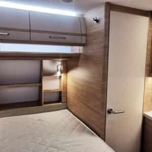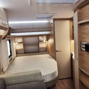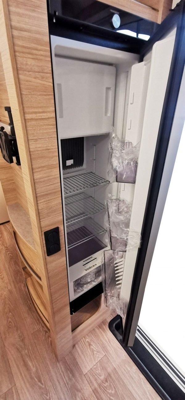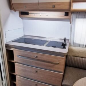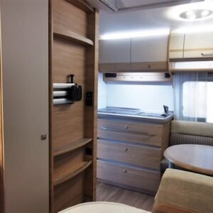 Armoires supérieures spacieuses, meublées de manière pratique avec 1 armoire pour les ustensiles de cuisine hauts et 1 armoire pour les verres et plus encore. Les tiroirs de la cuisine sont grands et profonds et peuvent facilement accueillir la plupart de ce dont vous avez besoin. 3 plaques chauffantes et un bon évier. Beaucoup de prix dans la cuisine et une indication de niveau séparément pour le réservoir d’eau. Accrochez-vous au mur du fond. Le réfrigérateur est génial et offre un bel espace avec un espace congélateur. Le réfrigérateur fonctionne sur 230 V, gaz ou 12 V et peut être ouvert des autres côtés.