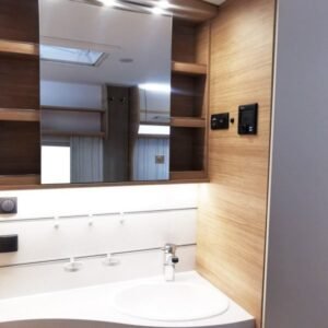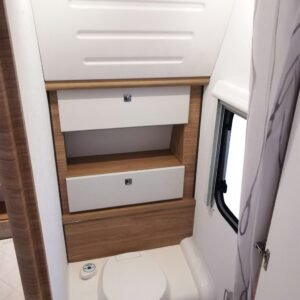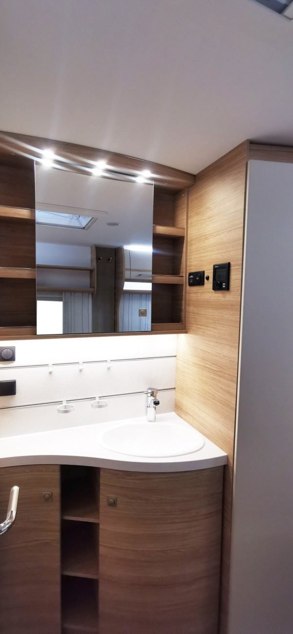 Salle de toilettes aménagée de manière pratique avec banc de toilettes, douche avec rideau. Les étagères astucieuses derrière les toilettes pour ranger les articles de toilette. A l’extérieur, on retrouve une charge à quatre points, un indicateur de batterie et un panneau Truma CP Plus pour contrôler le chauffage. (230V et gaz)