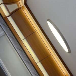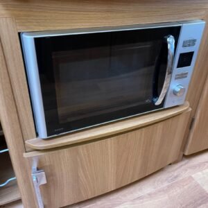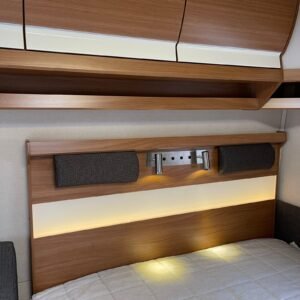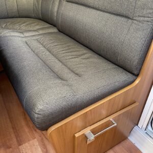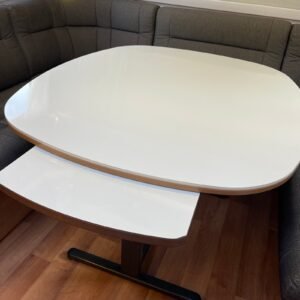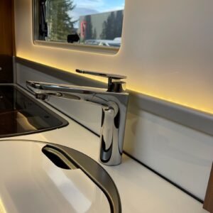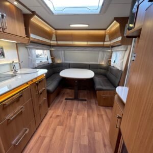 Caravane spacieuse adaptée à une utilisation hivernale comme estivale. Grand séjour circulaire à l’avant suivi d’une cuisine avec 3 plaques électriques et évier.