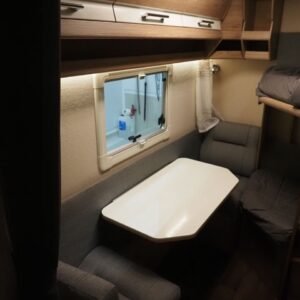 Superbe Kabe 660 avec une solution familiale avec lits superposés et un petit coin salon dans la chambre des enfants, salle de bain avec douche, lit double, beaucoup d’espace de rangement et bien équipé avec chauffage central et chauffage jaune à eau .
