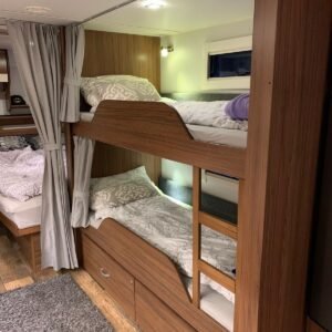 Caravane avec de grands lits superposés, un lit d’armoire, four, stéréo avec sub, changé pour un meilleur matelas dans le lit principal acheté du matelas star, matelas dans les lits superposés, monté ventilateur au-dessus du lit dans la trappe de toit derrière, auvent inclus, dispose de moover.