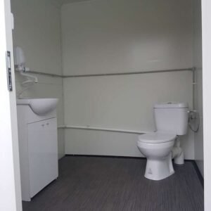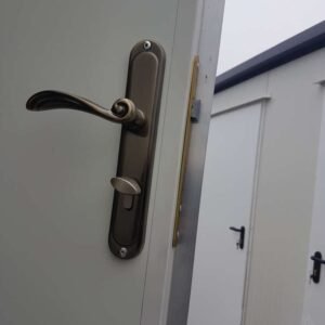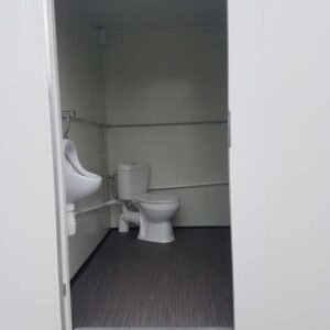 Structure en deux cabines égales (hommes/femmes). Les deux zones se composent d’une porte d’entrée avec serrure personnelle, de 2x escaliers galvanisés.